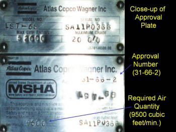 | NOTE: The approval number shown on the plate in this photo is dated. Machines must now meet the requirements of 30 CFR, Part 75, Subpart T. Machines with approval numbers beginning with 31-66 which are modified to comply with current regulations should now have approval numbers that begin with 31-213 or hold formal field modification approval through MSHA. The number following the last dash in the approval number shown merely indicates the number of times changes were made by the manufacturer (2 in this case).