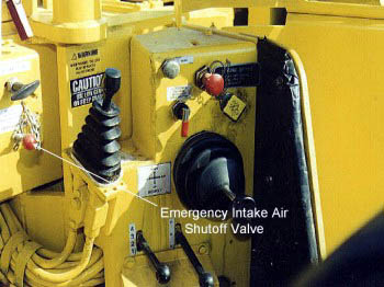 Permissible equipment is required to be equipped with a valve operable from the operator’s compartment to be used to shut off the intake air supply to the engine thereby causing the engine to shut down. The valve described will be shown in a subsequent slide. A means provided in the operator’s compartment to activate the valve is shown. When activated, the intake air valve is mechanically closed shutting off airflow to the engine’s combustion chambers.