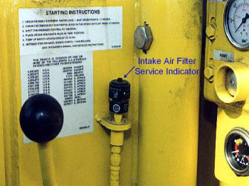 The intake air system for a diesel engine is equipped with an air cleaner service indicator which will show when the air cleaner (filter) needs to be replaced. The indicator used on the Wagner scoop is shown. The indicator is set in accordance with the engine manufacturer’s specifications. This indicator will show red with the engine running at high idle when the filter needs to be replaced.