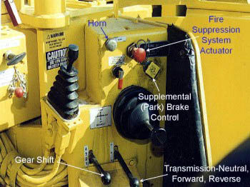 Shown are close-up views of the controls in the previous slide. In addition to service brakes, diesel equipment is required to be equipped with a supplemental braking system (park brake) with a means of activation in the operator’s compartment. This is shown along with the actuator for the fire suppression system, the warning device (horn), and the transmission directional and gear shift levers located to the right of the operator in the operator’s compartment.