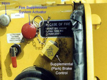 Shown are close-up views of the actuators for fire suppression, supplemental brake (park brake), and horn. The supplemental (park) brake control provides a means in the operator’s compartment to apply the supplemental brake manually without shutting down the engine.