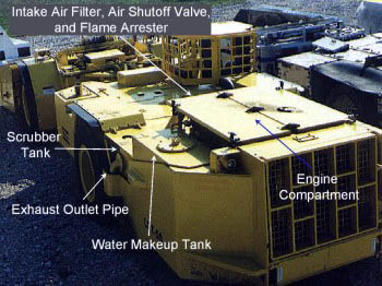 This visual emphasizes the location of the exhaust system and some of its associated components including the scrubber and exhaust outlet pipe.