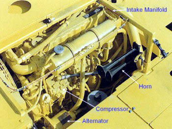 This shows the Caterpillar 3306 diesel engine. The power packages of permissible diesel machines are designed and constructed to guard against ignition of methane and coal dust by the hot engine and its components, surfaces, and by the internal combustion of the engine. A permissible machine is equipped with flame arresters on both the intake air and exhaust gas systems of the engine. The exhaust flame arrester on this machine is the water scrubber. The flame arresters quench flames that could be produced by an ignition of methane inside the engine, before the flames could propogate to an explosive environment. The portions of the intake and exhaust systems extending from the engine to the intake and exhaust flame arresters are manufactured and approved as explosion-proof and need to be maintained as such. Joints in these portions of these systems are secured with close tolerance fits and must be maintained. On permissible diesel machines, either flanged metal-to-metal joints or flanges fitted with metal or metal-clad gaskets are used. The explosion-proof joints on the Wagner scoop are equipped with metal-clad gaskets. All joints are to be secured tightly in place at all times using fasteners and lock washers, or other locking devices. Joints are to be checked weekly with appropriately sized feeler gauges.