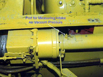 Periodic checks need to be made to ensure that the intake airflow to the engine is passing unobstructed through the air cleaner and flame arrester. A plugged and sealed port is provided between the flame arrester and engine for the purpose of connecting a gauge to measure the vacuum of the engine intake air. When tested, the amount of vacuum on the Caterpillar 3306 engine should not exceed 30 inches of water. Equipment manufacturers publish the maximum amount of vacuum for the engine of each machine. The port shown is plugged and the plug sealed with a seal wire to prevent loosening. This is critical since loosening or loss of the plug would result in a large opening for the passage of flames produced by an ignition of methane inside the engine.