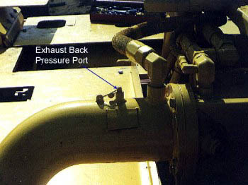 Periodic checks need to be made to ensure that the exhaust airflow from the engine is passing unobstructed through water in the scrubber. A plugged and sealed port is provided between the exhaust manifold and scrubber for the purpose of connecting a gauge to measure back pressure. The amount of back pressure for the Caterpillar 3306 engine must not exceed 34 inches of water. Equipment manufacturers publish the maximum amount of back pressure for the engine of each machine. The port shown is plugged and the plug sealed with a seal wire to prevent loosening. This is critical since loosening or loss of the plug would result in a large opening for the passage of flames produced by an ignition of methane inside the engine.