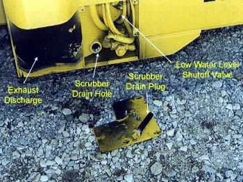 Here is a view of the bottom of the scrubber tank. The water scrubber system is required to be drained and flushed on each shift that the machine is operated. The safety component system of the scoop is equipped with a shutdown valve located in the scrubber which activates when a predetermined low water level in the scrubber is reached. Activation of the valve causes the engine to stop by shutting off fuel to the engine. The bottom of the scrubber is equipped with a plug, as shown, that can be used to drain the water to determine the level of water at which the valve will activate, causing the engine to shut down. This is accomplished by draining the water to the point at which the engine stops and then quickly reinserting the plug. The level of water can then be measured from the top of the scrubber (at the scrubber fill port with a dipstick) and compared with manufacturer’s requirements to determine if the low water level shutdown valve is properly adjusted. The proper level of water at shutdown for the Wagner scoop is at least 5-1/2 inches of water. The scrubber requires this minimum water level to be considered as a flame arrester.