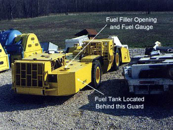This photo shows the location of the fuel tank, fuel filler opening, and fuel gauge on the machine.