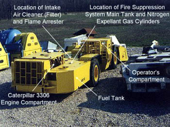 There are many requirements for the safe design and use of permissible diesel equipment. These include various safety features in the operator’s compartment, the engine and it’s air intake and exhaust system, and fire suppression, electrical, and fuel systems. This shows the approximate location of some of these devices. The slides that follow will continue to show locations of components from various angles.