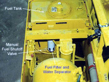 The fuel system is required to be equipped with a manual fuel shutoff valve located close to the tank and a fuel filter and water separator as shown. The manual fuel shutoff valve must be in a location that is readily accessible to maintenance personnel.
