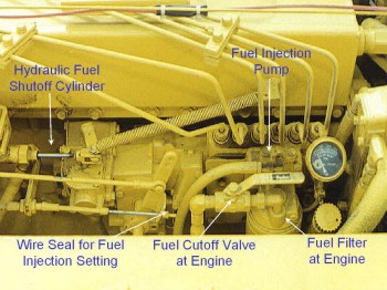 This photo shows the clamped fuel injection lines extending to the injectors, a second fuel cutoff valve and filter, fuel injection pump, hydraulically activated fuel rack shutoff valve, and the seal wire for preventing unauthorized fuel adjustments. The hydraulically activated fuel shutoff valve is used to shut off fuel supply to the engine when the overtemperature sensor(s) or the low water level shutdown valve in the scrubber activates. Each of these devices when activated will, in turn, vent the hydraulic pressure in the cylinder, shutting off the fuel rack, and causing engine shutdown. The fuel adjustment setting was determined during the engine approval process. The seal wire must be maintained on the fuel adjustment setting compartment.