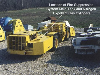 The Wagner scoop is equipped with an Ansul CHECKFIRE MP (Mine Permissible) automatic fire suppression system. The Anusl CHECKFIRE MP is an electric detection and activation system. Permissible diesel-powered equipment must have an automatic or manual fire suppression system that meets the requirements of 30 CFR 75.1911.