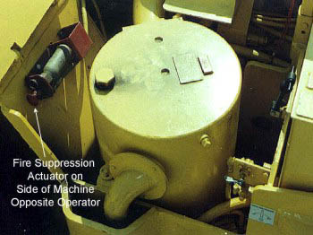 Manual actuators for the fire suppression system are required to be installed on each side of the machine. This manual actuator is installed on the side of the machine opposite the operator. It is located next to the scrubber tank.