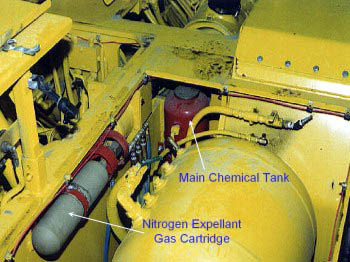 Shown are the main chemical tank and nitrogen expellant gas cylinders for the fire suppression system. When a fire occurs and the system is activated either automatically or manually, the gas expellant cylinders are activated by pressure from the actuator cartridges located either in the operator’s compartment or beside the scrubber. The expellant cartridges then supply pressure to the dry chemical tank(s) where it fluidizes the dry chemical and distributes it to all nozzles, which are placed in critical areas of the machine, to extinguish the fire.