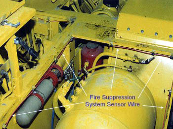 Sensor wires are installed throughout the area of the machine where the compressed air tank and fuel tank (not shown) are located. The system, including the detection wire, must be installed in a protected location or guarded to minimize physical damage from routine vehicle operations.