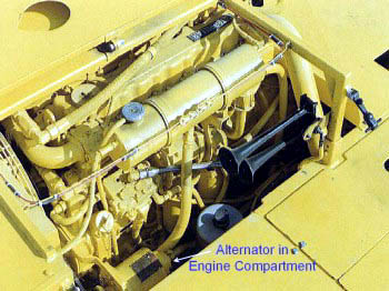 This view of the Caterpillar 3306 diesel engine shows the alternator. The fuses providing electrical protection for the machine’s electrical system are located in the housing of the alternator.