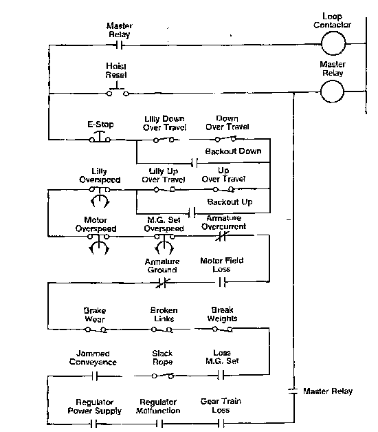 The following is a discussion of these various faults, why they are necessary and typical devices used to detect the faults. Figure 1 is a typical master relay circuit diagram showing several of the possible fault conditions and should be used as a reference to understand how all the safety features are connected.
