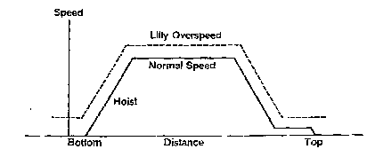 Hoist overspeed is a serious condition and can result in severe damage to equipment and injury to personnel. There are normally three types of overspeed conditions. The most critical is the hoist overspeed which is set to stop the hoist when the man cage exceeds a predetermined speed. This is usually detected by the Lilly controller which is normally set up as a programmed overspeed device., This means that if the hoist goes faster than the designed speed when accelerating or decelerating at the top or bottom or while running at its normal speed in the shaftway, the Lilly Controller will detect this condition and emergency stop the hoist. Figure 2 shows the normal speed curve while hoisting or lowering. The dotted line shows at what speed the drive will trip as a function of the length of the shaft. This overspeed device is wired into the emergency stop circuit, as shown in figure 1.