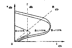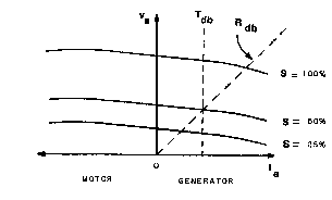 The dynamic braking voltage (Vdb) intercept corresponds to no-load terminal voltage (Rdb = omega OMEGA, no retarding torque). The dynamic braking current, idb, intercept occurs when the armature terminals are shorted (Rdb = 0 OMEGA; residual retarding torque). The maximum retarding torque occurs for the operating point at the peak of the dynamic braking current. As discussed earlier, optimum dynamic retarding effort is not always desirable when the effects of compound braking are considered.