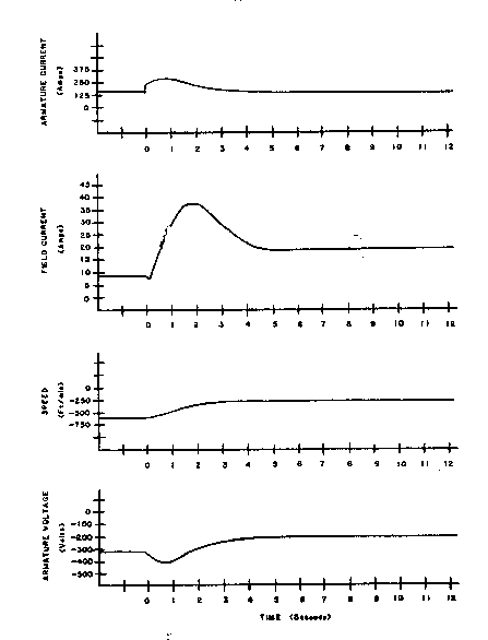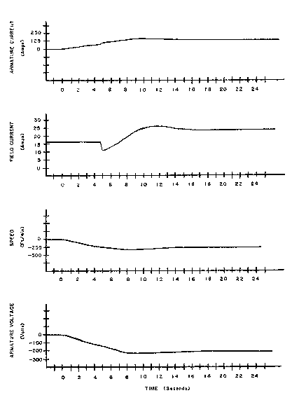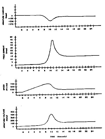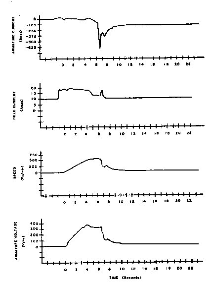 The armature current, armature voltage, field current, and motor speed were recorded on a strip chart during the tests. The polarity of the signals corresponds to the four quadrants of operation defined in figure 1.