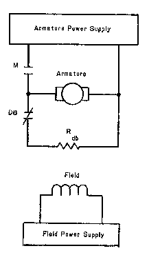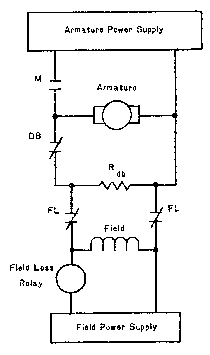 This method of dynamic braking is the most complicated to design and expensive to install when compared to the previous two methods. However, it does provide the most desirable braking of the hoisting system. This control scheme is illustrated in figure 4. The method requires a device to sense when there is no field current being supplied by the motor field power source. This is usually accomplished by using a field-loss relay that is held closed as a function of the current in the field. When field current is lost, the relay drops out.
