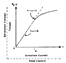 These equations assume that the magnetic system of the machine is linear. This is true when magnetic saturation, hysteresis, and magnetic retention in the field poles are neglected. The magnetization curve illustrating the effect of saturation but neglecting hysteresis and magnetic retention is shown in figure 5.